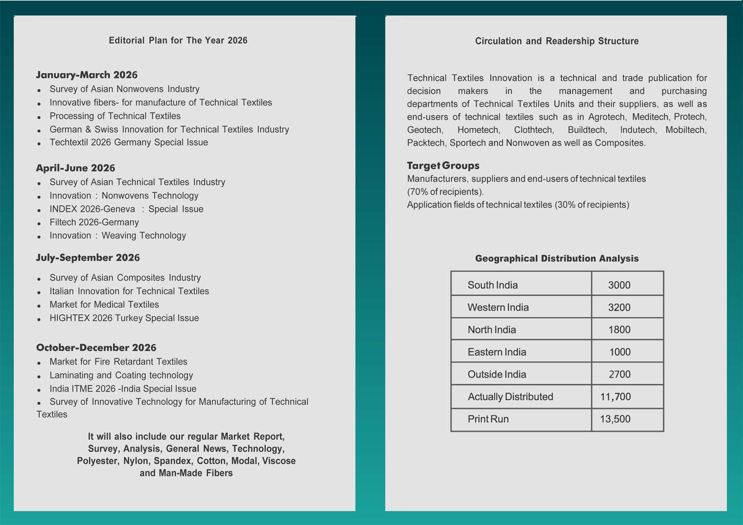 TECHNICAL TEXTILES INNOVATION is one of the largest Circulating NONWOVENS AND TECHNICAL TEXTILES Magazine in Indian Subcontinent. It features Trade and Technology in relations to manufacture of NONWOVENS and TECHNICAL TEXTILES.